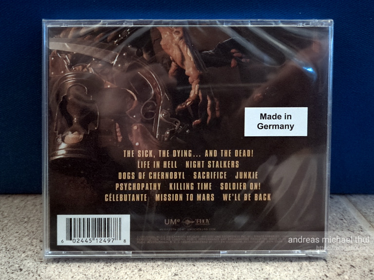 Ein Rätsel gibt mir der Aufkleber “Made In Germany” auf Megadeths “The Sick, The Dying… And The Dead!” auf: lt. Wikipedia wurde die Scheibe in den USA aufgenommen und ob eine in Deutschland hergestellte CD “manufactured by optimal media GmbH” nun unbedingt ein so großer Kaufanreiz sein sollte, daß dies einen Aufkleber wert ist?